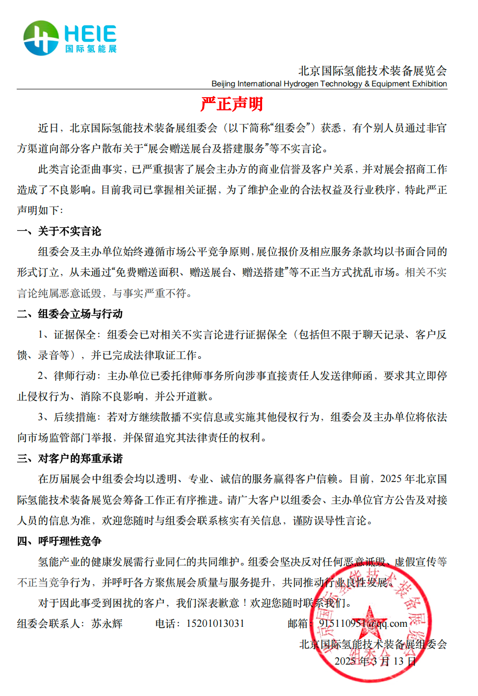 2025-03-21近年来,全球氢能产业进入高速发展期,中国凭借政策支持与市场需求双轮驱动,已成为全球最大的氢能应用市场。作为氢能行业的盛会,HEIE2025北京国际氢能展以其专业的组织、丰富的资源和优质的服务,吸引了众多氢能企业的关注和参与。 天津新氢动力科技有限公司(以下简称“新氢动力&rd.........【详情】