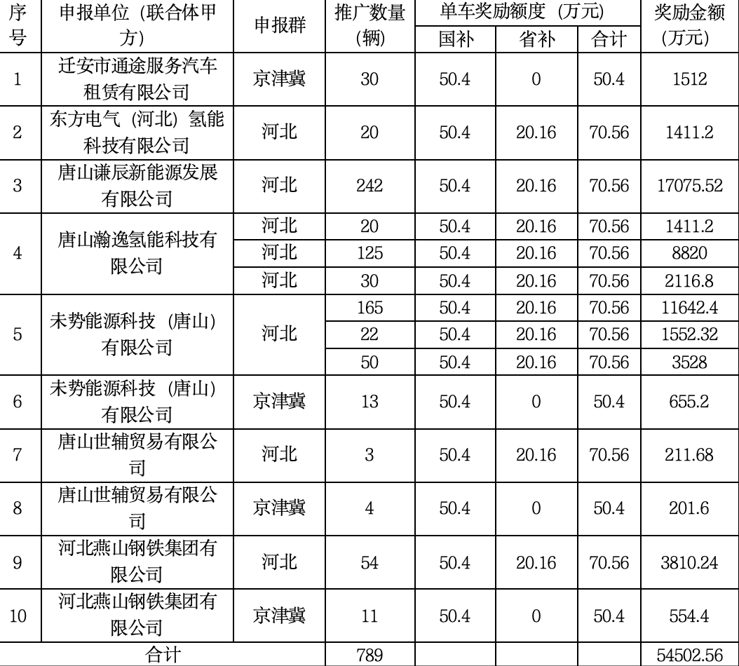 (HEIE振威国际氢能展组委会报道)11月4日,唐山市工信局在官网发布了《关于唐山市第二年度燃料电池汽车示范应用奖补资金分配计划的公示》。根据公示,分属两个城市群的10家企业789辆燃料电池汽车将获得示范奖励,奖励金额为54502万元。其中京津冀城市群为4家企业共58辆,河北城市群为6家企业共731辆;京津冀城市群的车辆仅获得国补与市补。