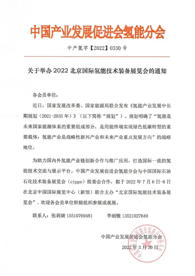 关于举办“2022北京国际氢能技术装备展览会”的通知