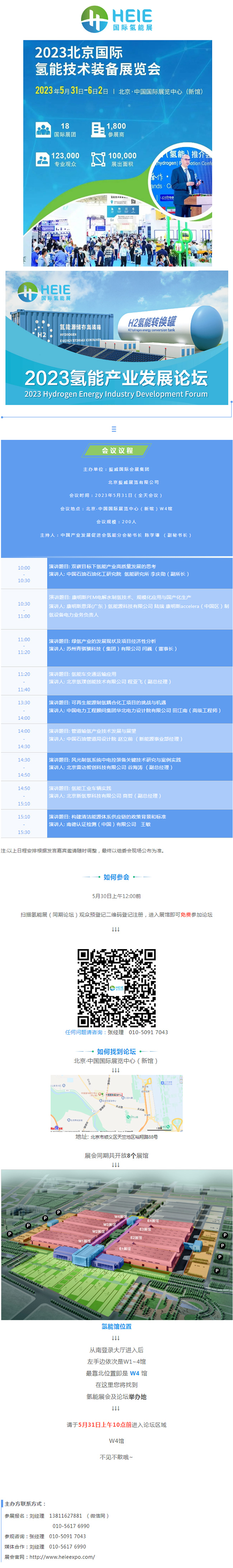 2023年5月31日-6月2日在北京·中国国际展览中心(新馆)举办“2023HEIE北京国际氢能技术装备展览会”,展会涵盖氢制备、储运、加注和监测;燃料电池系统及成果应用;关键零部件;燃料电池汽车等重点领域。