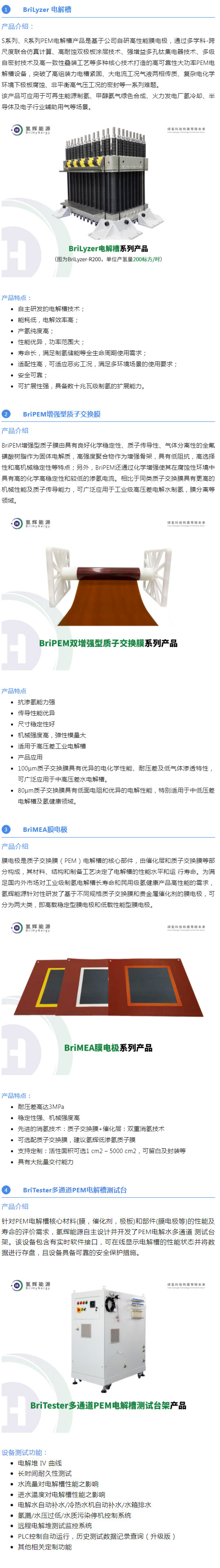 公司推出了以英文品牌 “BriHyNergy ”打造的具有强识别性PEM电解水制氢系列产品,包括:BriLyzer电解槽系列产品、BriPEM增强型质子交换膜系列产品、BriMEA膜电极系列产品、BriTester多通道PEM电解槽测试台架。