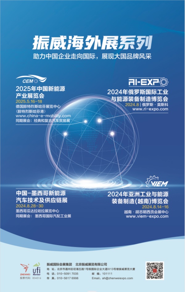 会展是产业进步的助推器。作为全球会展综合服务商,振威会展积极布局境外展会,2024年将在俄罗斯、墨西哥、越南、马来西亚等多地举办装备制造与新能源产业展会。截至目前,振威会展旗下2024年俄罗斯国际工业与能源装备制造博览会、2024年亚洲工业与能源装备制造(越南)博览会、2024年亚洲工业与能源装备制造(马来西亚)博览会已被国内多地政府列入境外展览重点支持目录。2025年振威会展将携手腓特烈斯哈芬展览公司在德举办中国新能源产业展览会,结合双方的展览资源、品牌优势、地缘优势,打造桥接中德乃至中欧新能源行业的精彩展会,推动全球新能源产业发展。