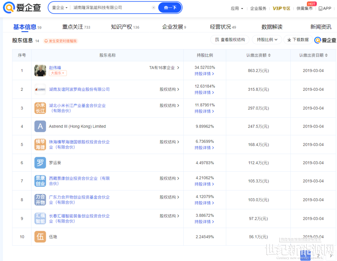 近日,湖南隆深氢能科技有限公司近日发生工商变更,新增湖北小米长江产业基金合伙企业(有限合伙)等为股东。湖南隆深氢能科技有限公司成立于2017年,法定代表人为赵伟峰,注册资本2500万元人民币,经营范围包含:软件开发;工程和技术研究和试验发展等。据其官网,该公司专业从事燃料电池和PEM电解槽专用设备及产线的研发、生产与销售。湖北小米长江产业基金合伙企业由小米、格力、三峡等合资成立。