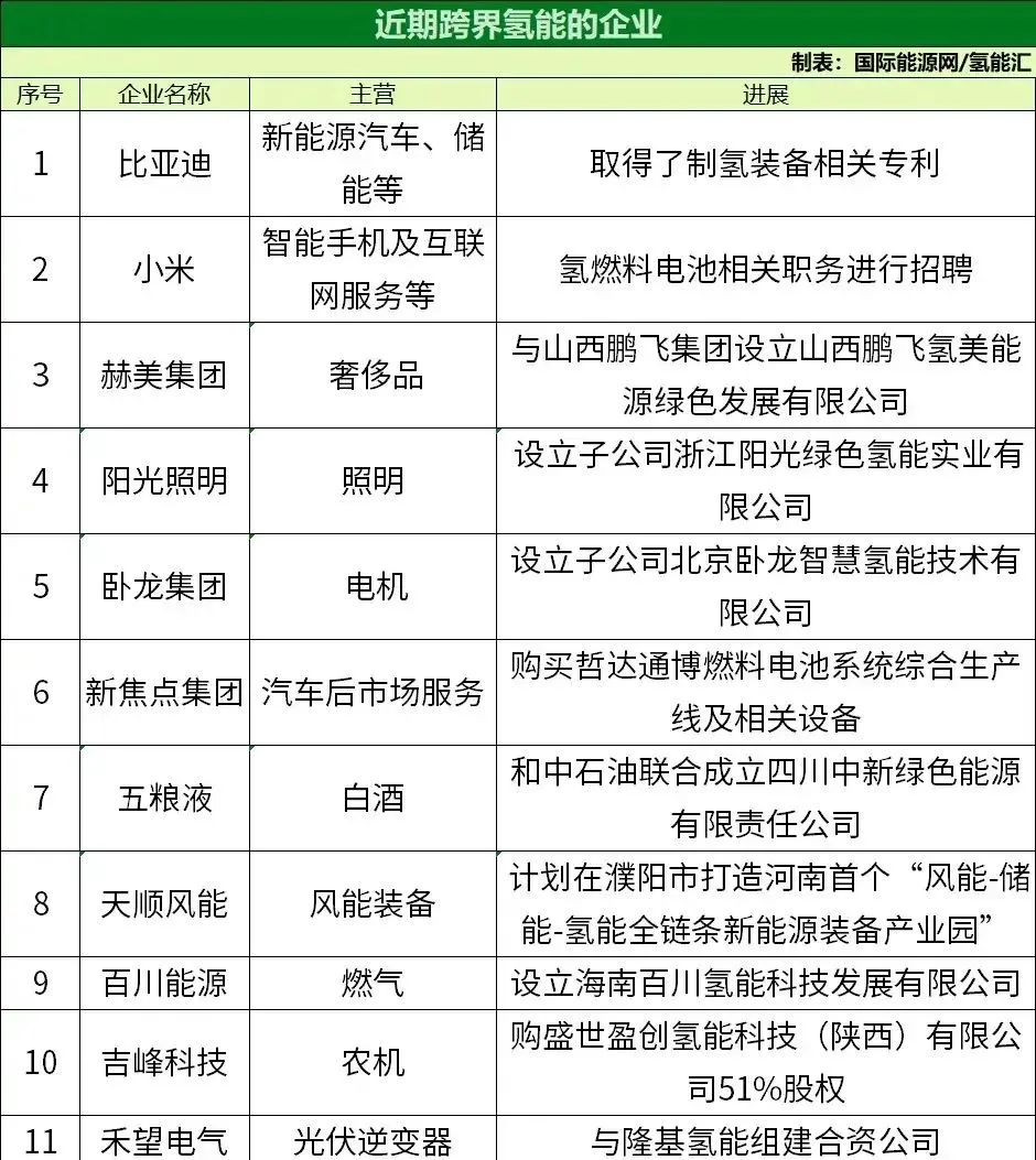 近半年以来,已经有多家企业发布了跨界进入氢能领域的各种信息,这些企业涉及照明、汽车服务、农机、风电装备、白酒、燃气等多个行业,甚至包括和能源完全不搭界的奢侈品行业。