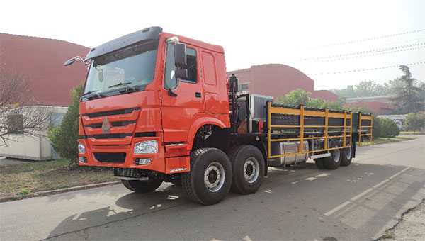 该车主要采用载货汽车底盘,加装副车架、起重架(选装)、牵引鞍座、取力装置、液压系统、液压绞车、起升系统等构成,能够实现撬装设备拖运、起重和牵引多种功能,结构新颖、使用便捷,可大幅降低钻井公司的搬迁费用, 提高经济效益,增强市场的竞争力。