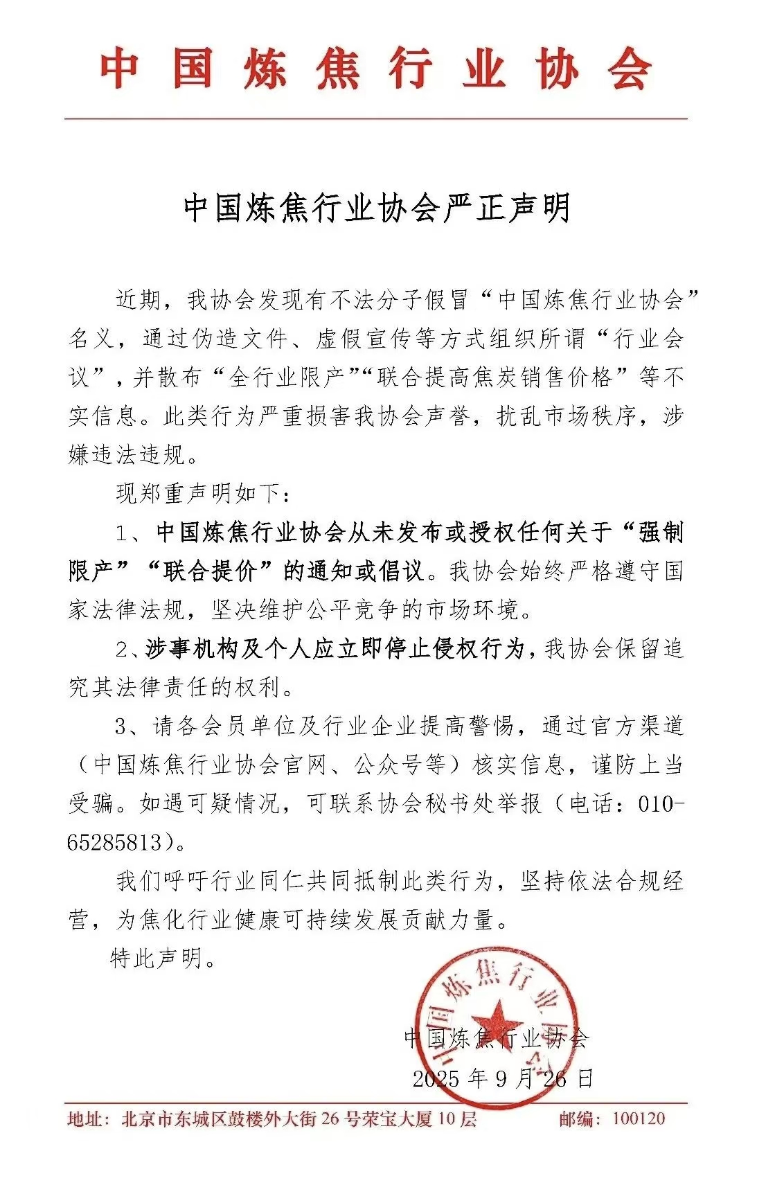 中国炼焦行业协会辟谣:从未发布“强制限产”等通知